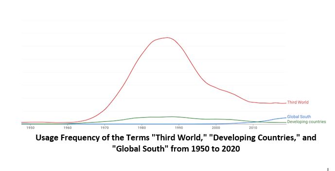 As the following chart illustrates, the use of the term Third World in international relations literature and international documents began to rise in the mid-1960s and peaked in 1990. Over these three decades, neither of the other two terms, "Developing Countries" or "Global South," was used in the literature to the extent of "Third World." Following the dissolution of the Eastern Bloc, the usage of "Third World" gradually declined. As the chart below shows, the use of the term Global South has been steadily increasing since early 2010.