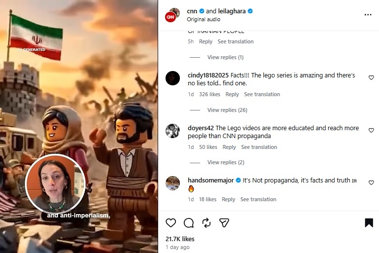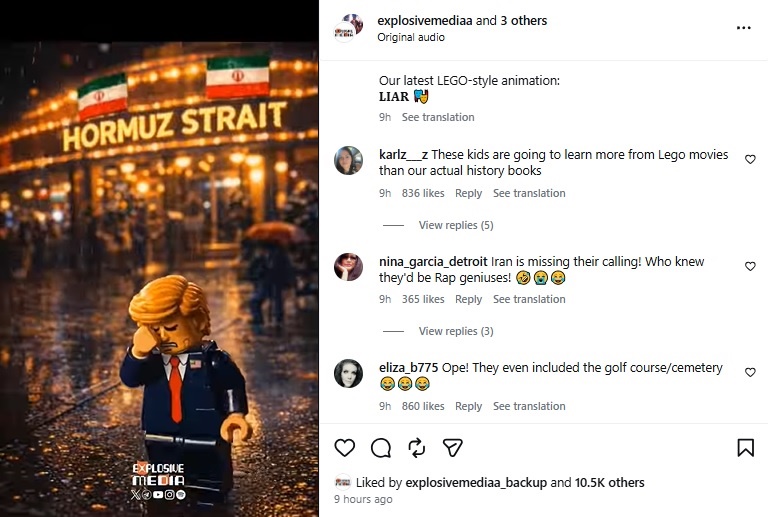 برای مثال یک گروه مستقل نوظهور به نام Explosive Media، ویدیوهای تولیدشده با هوش مصنوعی را در قالبهای آشنا -مانند استفاده از لِگو، زبان طنز و موسیقی رپ و هیپهاپ- منتشر میکند که فضای مجازی غربی-آمریکایی را به شدت درگیر کرده است. از نقاط قوت این رویکرد، انتخاب دقیق مخاطب است. استفاده از سازههای لِگو، رپ آمریکایی، طنز و عناصر بصری آشنا نشان میدهد که این محتوا بهطور خاص برای مخاطبان بینالمللی، بهویژه در غرب و نسل جوان طراحی شده است.